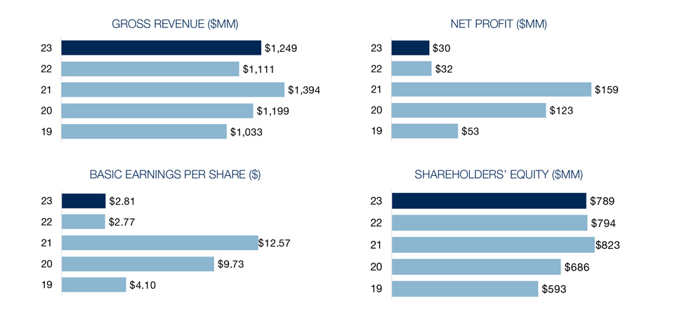 On December 31, 2023, the Company had a total of 10,186,783 Class A shares outstanding with our book value rising to a record valuation of $76.72 per share as compared to $72.41 at the end of 2022. Under our repurchase authorization and Dutch Auction tender offer, we took advantage of the lower level of our share price and bought back 900,518 shares for $35 million, at an average price of $39.00 per share. In total, the Company returned total capital of nearly $42 million to shareholders through the combination of dividends and share repurchases. Our share repurchases over the period increased shareholder value as we purchased stock at a compelling value.
