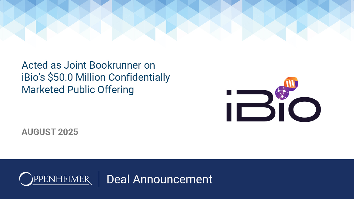 Oppenheimer & Co. Inc. acted as Joint Bookrunner on iBio’s $50.0 Million Confidentially Marketed Public Offering