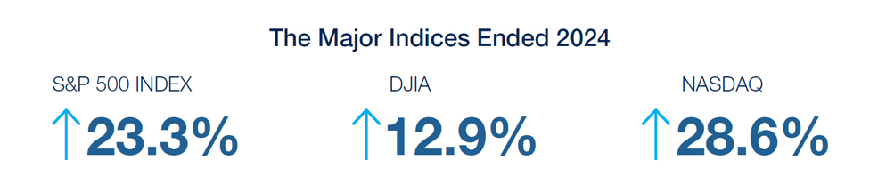 The U.S. Economy continued to outperform during 2024. Despite widespread expectations for a downturn driven by high interest rates, the economy continued to expand producing growth of 2.8% for the year, more than respectable, and far ahead of the rest of the industrialized world. Economic growth, a reduction in interest rates and the high expectations for capital expenditures around Artificial Intelligence (AI) drove the U.S. Equity markets to new record highs with the S&P 500 reaching 5881.63 (up 23.3%) at year-end. Markets were again led by the “Magnificent Seven” which were up by 63% in 2024 (contributing over 50% of the increase in the index). The other major averages: the Dow Jones Industrial Average reached 42544.22 (up 12.9%) and the NASDAQ Composite reached 19310.79 (up 28.6%).