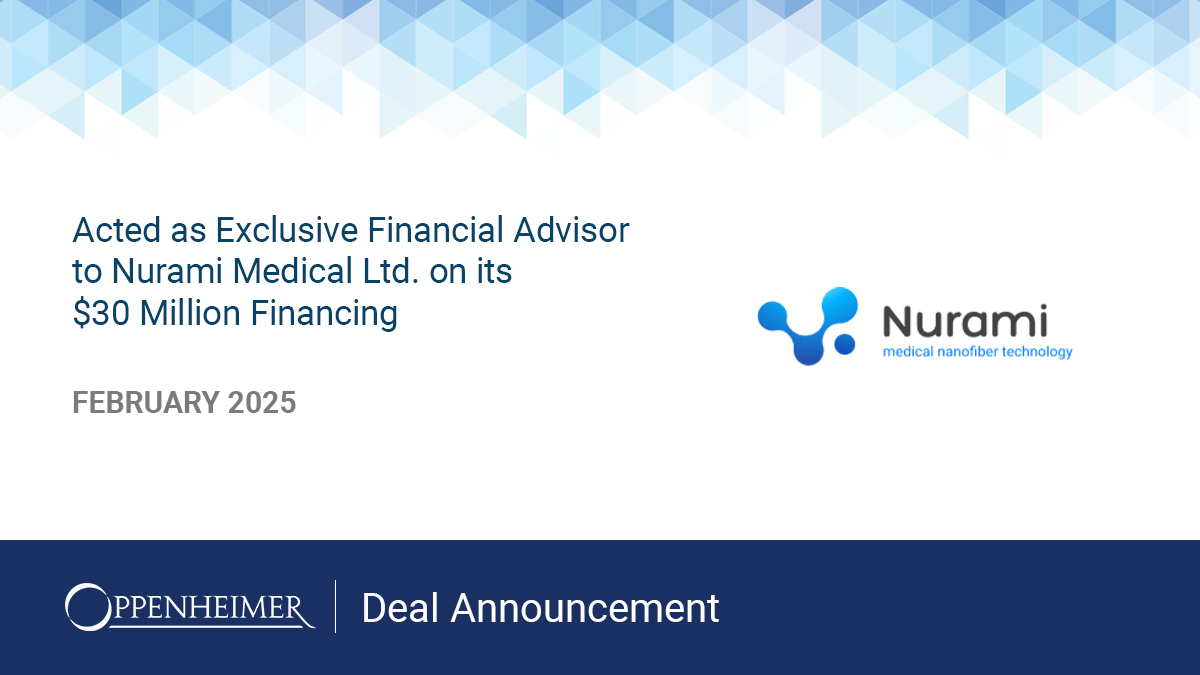 Oppenheimer & Co. Inc. acted as Exclusive Financial Advisor to Nurami Medical Ltd. on its $30 million financing