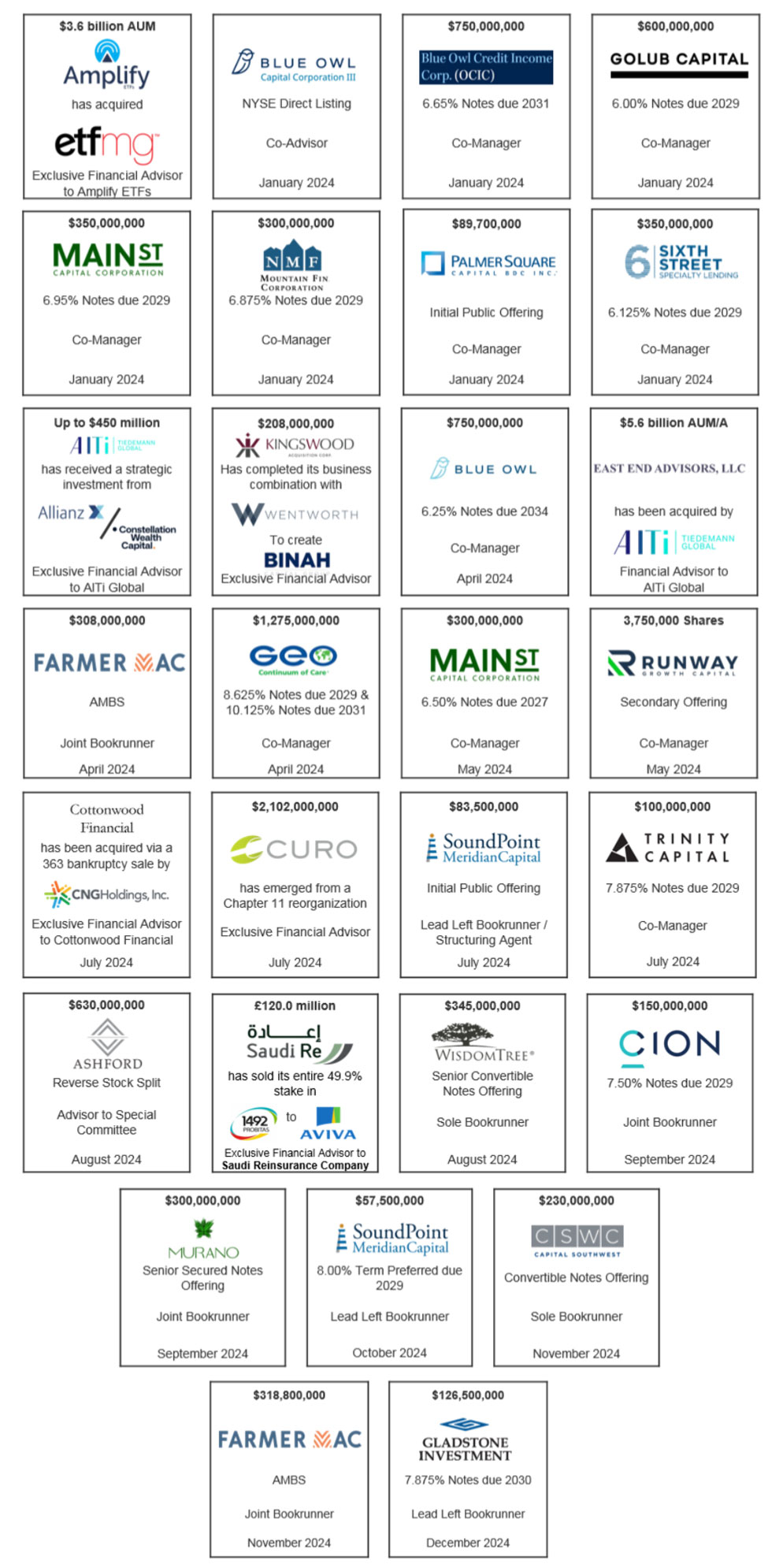 In 2024, Oppenheimer’s Financial Institutions Investment Banking team had a dynamic and successful year, executing a wide range of transactions and providing tailored solutions to meet the diverse needs of their clients. Through strategic capital markets activities and expert advisory services, the team demonstrated their commitment to delivering exceptional results and creating lasting value.